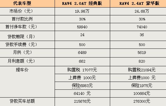 RAV4要比CRV更加野性一点,相比汉兰达的“雄伟”,又带一点收敛,这也正是它的独特之处,喜欢这款车的朋友不妨也可以考虑一下贷款买车,分别有两种方案,一种是首付三成贷款两年,另外一种就是首付三成贷款三年。我们可以先看两年还款方案,首付款也是三成,金额为但是两年下来,总共买车的钱要比净车款多出了1.6万元,另外一种方案三年还清贷款后是要多付出2.9万元。希望通过贷款的方式来购买这款车的朋友要根据自己的实际情况来确定方案。