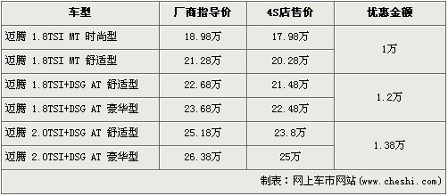 据一汽大众经销店销售人员介绍,迈腾全系车型全系最高优惠1.38万元。经1万元的优惠后,全系入门级的1.8TSI MT时尚型的售价从18.98万元下降到了17.98万元。全系最高配的迈腾2.0TSI豪华版经1.38万元优惠后,售价降到了25万元。销售人员还介绍,目前店内迈腾全系有现车。