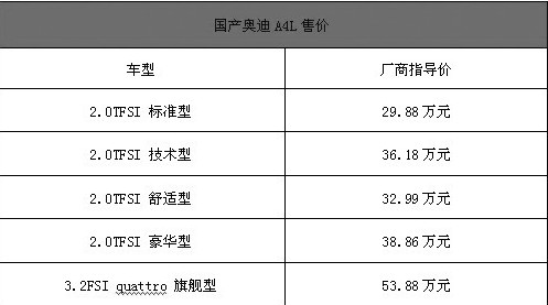 2009年1月5日,一汽-大众在海南省三亚市正式宣布其开始在国内销售奥迪A4L,这是第8代奥迪A4的国内版本。新的奥迪A4L在今天共有装备2款发动机的5款车型销售,官方指导价格从29.88到53.88万元,相信在一段时期内,国内消费者在全国各大奥迪4S店购买A4L的时候都会执行这个售价。
