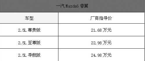 2009年4月12日,一汽马自达宣布Mazda6睿翼正式上市。初期上市的Mazda6睿翼只有2.5L排量的三款车型可以选择,售价在21.68-24.98万元,即日起全国140家一汽马自达4S店就可以接受预订,首批新车将于4月25日到达展厅。