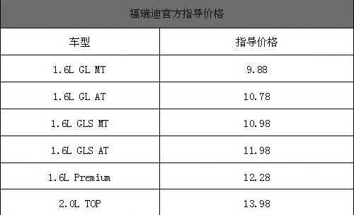 6月18日晚,东风悦达起亚全新一代紧凑车型福瑞迪正式上市,共有1.6L和2.0L两种排量共6款车型可供消费者选择,价格从9.88万元到13.98万元,比竞争对手悦动定价稍低一些。以上是福瑞迪各款车型详细价格表。