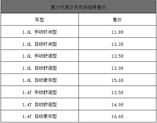 2009年10月19日,结束了欧亚大陆的长途跨越,完成了对完美城市的探寻与交融,人们期待已久的第六代高尔夫终于在长春正式宣布上市。第六代高尔夫共推出了1.6L和1.4TSI两种排量、八款车型供消费者选择,两种排量的发动机都可匹配7速DSG双离合自动变速箱和5挡手动变速箱,售价11.88万-16.68万元,具体售价如下表:第六代高尔夫市场指导售价