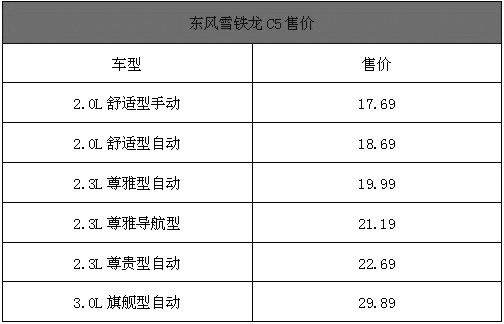 2009年11月23日,在第七届中国国际汽车博览会上,备受瞩目的09年B级车市压轴之作,东风雪铁龙品牌战略旗舰车型C5正式公布价格。东风雪铁龙C5共有2.0L、2.3L和3.0L三种排量,四种级别可供选择,其价格区间为17.69万-29.89万元。从即日起,全国各指定销售网点开始接受预订,首批展车也将陆续到店,并于2010年1月初正式交付。