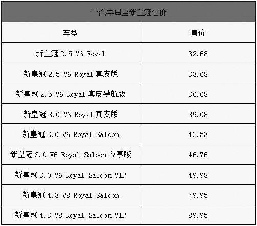 2009年12月14日,一汽丰田全新CROWN皇冠在北京公布售价并宣布正式上市,此次上市共推出2.5L、3.0L和4.3L三种排量共9款车型,并有五种车身颜色和两种内饰颜色可选,售价32.68-89.95万元,具体售价如下表:一汽丰田全新皇冠售价