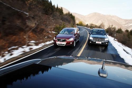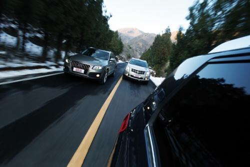 所有4款车都配备了3.0升以上的V6发动机,这意味着所有4位选手理论上都拥有不错的动力表现。其中XC60还配备了一套双涡轮增压装置。所以沃尔沃在力量方面占有先天优势。虽然280马力最大功率并没有比奔驰和奥迪领先多少(Q5为270马力,GLK则是272马力),但从1500转一直能维持到4800转的400牛·米最大扭矩无疑让它的中段加速力显得尤其突出。宽泛的扭矩输出带还掩盖了6速自动变速器反应欠敏捷的缺陷。但即使如此,变速器在普通模式下完成降档提速的顿挫依然有点儿明显。所以在城市高速路上跟着SRX一路杀向拍摄地点时,我一直都保持在手动模式。将速度维持在60-120之间,我需要做的只是在响应敏捷的4档和5档之间来回切换,巨大的低转扭矩让提速变得很容易,所以在那些按常理需要使用3档的地方也可以维持在4档,稍微多给一点儿油,问题就解决了。