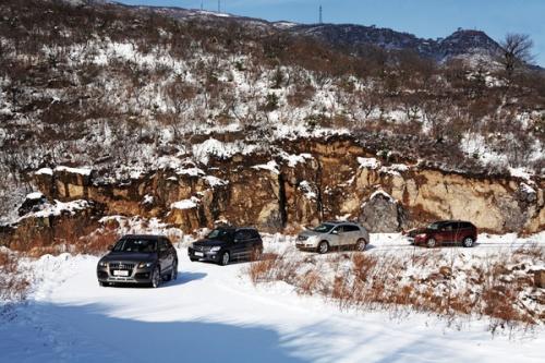 然后需要集中说明的是它们在雪地中的表现。我们曾在一条被积雪完全覆盖的道路上驾驶了好一会儿,经过反复的比较,我发觉XC60和SRX的表现几乎相差无几,两辆车在抓地力方面不存在什么明显的问题,最多只是在起步和停车时会发生一些打滑,它们最主要的问题是方向盘在这种情况下会完全丧失路感,这让人在驾驶时不免感到战战兢兢。Q5的情况要比前面提到的两台车稍好一些,但一旦稍微快一些就会让人产生信心不足的感觉,在同样的条件下quattro发生打滑的次数明显较SRX和XC60来得少。GLK无疑是在这种路面上表现最杰出的车型,在普通道路上略显闲散的方向盘在这种路面上却能得到充分的信息反馈,而且GLK是唯一在这种路面能让人放心给油快速前行的车辆,所以GLK无疑是在低牵引力条件的路面上表现最好的车型。