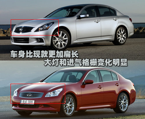 G37改款车型外观方面有多处变化。车身整体比现款更显扁长,拉升的熏黑前大灯更增加了几分霸气,进气格栅比老款有所加宽,外轮廓的镀铬装饰也经过重新定义。17寸运动轮毂外观也有所加强。