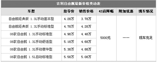 相比老款自由舰的稳重大气,08款自由舰采用了欧式经典大灯使得车的外形更灵动,简练的格栅线条分明;整车的外形更具动感与活力。08款自由舰使用的是吉利148的变速箱,大大提升换档的轻便性和顺畅性。新开发的JL-S148手动变速器在降低油耗、加速性能、换挡舒适性和噪声级方面均有明显进步。08款自由舰后悬架采用世界最流行的抗扭梁复合式悬架,有利于改善汽车的纵向角振动,提高了汽车乘坐舒适性及操稳性:调整了减振器相对阻尼系数值使得车身对蛇行反应较灵敏,提高了转向操纵性。