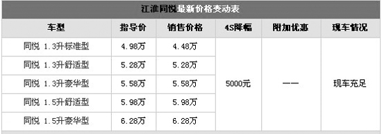 江淮同悦有1.3L和1.5L两种排量,全为手动档车型。分标准型、舒适型和豪华型三种配置。标准型无安全气囊,配备有ABS制动防抱死系统,四门车窗和电调后视镜;舒适型增添了驾驶座安全气囊、倒车雷达、遥控钥匙和中控;豪华型相对于舒适型升级了副驾安全气囊和前雾灯安全配置,配备了单碟CD机并升级了音响系统,增加了后视镜加热功能和铝合金轮毂。