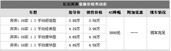 长安奔奔1.0标准版标配同色后视镜、同色防擦条、外接音源接口、前后雾灯和手动空调等基础配置;1.3手动舒适版在此基础上增加了驾驶室安全气囊和中空钥匙等配置;经典版在舒适版基础上增加了副驾驶座安全气囊、遥控钥匙、铝合金轮毂以及遮阳板化妆镜等装置;豪华版在经典版基础上增加了单碟CD和前后电动车窗等配置;超值版在豪华版基础上增加了ABS/EBD以及发动机电子防盗系统。