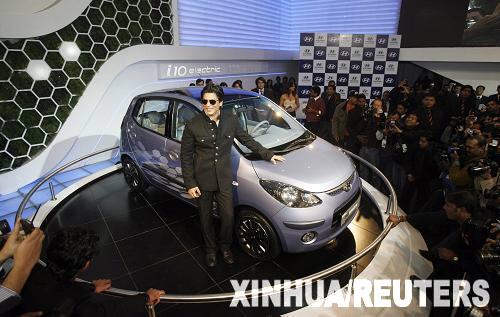 1月6日,在印度首都新德里举行的印度汽车展上,宝莱坞著名影星沙鲁克·汗站在一辆新型电动汽车旁,号召人们使用环保节能汽车。新华社/路透