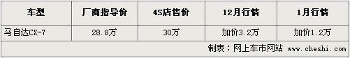 据一汽马自达4S店销售人员介绍:CX-7自上市起一直加价3.2万元,近期该车型加价所有降低,提现车需加价1.2万元,日前店内有黑色及银色现车供应,购车可赠送贴膜、倒车雷达等装饰。如消费者有意购买,到店详谈会有更优惠的价格。北京地区各4S店由于订单不同,各店销售的现车颜色有所不同。