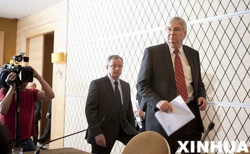 1月21日,在比利时首都布鲁塞尔,欧宝公司首席执行官、通用汽车欧洲公司负责人瑞里(前)出席新闻发布会。
