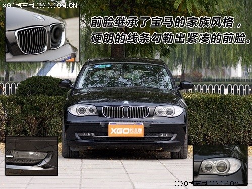 在前脸外观上,宝马1系沿用了家族传统的双肾形中网造型;前大灯也与宝马常用的鹰眼式设计很相似,但下垂的的“眼尾”使它没有了“兄长们”常见的傲气凌人,看上去反而更有亲和力了。而且细心的观者已经能从前大灯里找到120i与130i的第一个不同——130i使用了宝马惯用的天使眼,看上去更有豪华气质。