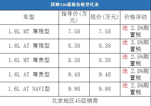 我们以风神S30最低配车型为例,该车的官方指导价格为7.58万元,2.5%的购置税算下来是1620元,也就是说现在购买风神S30有1600元以上的优惠。据经销商介绍,目前店内现车数量一般,部分车型和颜色有缺货的情况,目前店内现车颜色以水墨灰、银色和黑色居多。北京地区的一些综合经销商处,风神S30全系可优惠3000元,不过购车后需要在店内做一条龙服务才能享受到优惠。