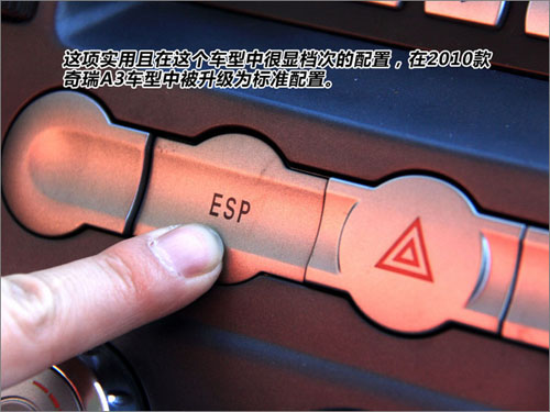 在内饰方面,2010款奇瑞A3也是完全沿用了前款车型的设计,只是在一些安全性配置方面有所加强。首先,她们引以为傲的ESP功能更加亲民的改成了全系标配。其次在一些高配车型上,由双气囊改成了六气囊,除原有的正副驾驶位的气囊外,又在两侧的A、B柱上加装了安全气帘,是车辆的安全性得到很到的加强。