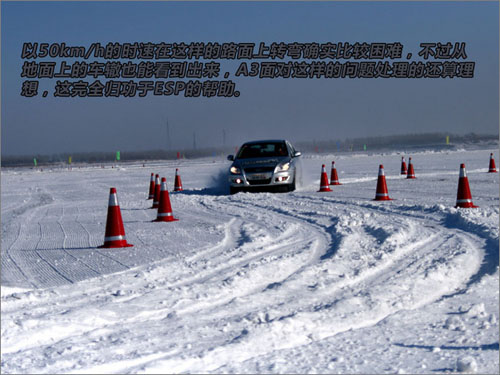 在雪地上行驶,过于光滑的路面是最大的安全隐患,几乎为零的摩擦力使得四个轮子几乎抓不住地面。在专业教练的陪同下,我们首先在开启ESP功能的情况下的行驶中躲避障碍物的体验。以预定车速进入车道后将车辆加速至50-60km/h,向左躲避面前的一个装桶,第一个紧急变线时,(将方向盘的向左的转向角度故意打的比常态更大一些,目的是为了让车底的转向传感器有更明显的认知,从而引导ESP更好的工作。)在车内可以比较明显的感觉到ESP为了纠正车辆即将出现的转向不足的问题给车辆的左后轮施加了制动力,从而使车辆比较顺利的换到了旁边的车道内。在这之后赶紧回正方向,ESP为了纠正车辆有可能出现的转向过度的问题又给左前轮施加了制动力,从而使得车辆平稳的留在了障碍物左侧的车道内。