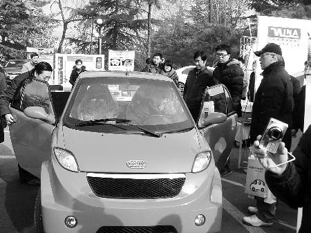 1月31日,济南南郊宾馆,不少市民来参观正在展示的电动汽车。