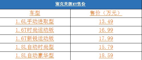 1月23日,上海通用全新五门轿跑英朗正式上市,据悉此次上市共推五款车型,分别为1.6L手动进取版、1.8L自动时尚版、1.8L自动豪华版、1.6T时尚运动版及1.6T新锐运动版,售价13.49-18.59万元,具体售价如下表所示: