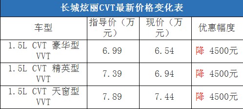 近日,编辑从北京地区综合经销商处了解到,购买长城炫丽CVT车型有4500元的现金优惠,店内有黑色现车在售,部分车型预定等待10天左右就可以提车。据经销商透露,消费者要想以这个价格提车,需要在店内做购车一条龙服务,其中车辆四项基本保险可以打8折(约合2800-2900元左右)。以下是长城炫丽CVT最新价格变化表: