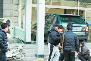 昨天下午4时许,北三环安华桥西北角的瑞德大厦门前一片狼藉。一辆原本要停车入位的路虎越野车,撞进了大厦门厅左侧的玻璃门。正在门前执勤的保安反应迅速,才躲开了这只“疯狂”的“老虎”。