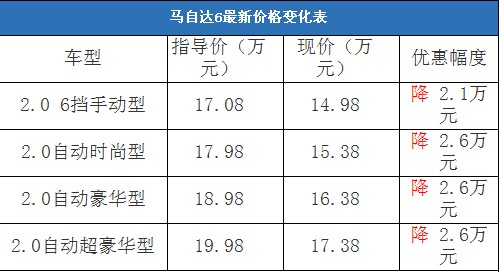 近日,编辑从北京地区某一汽马自达4S经销商处了解到,马自达6的现车充足,但是全系只能优惠3000元,更多的优惠需要消费者到店详谈才能确定。相比之下,北京地区综合经销商处的马自达6自动挡车型的现车比较充足,购车可以优惠2.6万元,手动挡的现车较少,可以优惠2.1万元,降价幅度与去年末相比有了比较可观的提升。不过据经销商透露,消费者要想以这个价格提车,需要在店内做购车一条龙服务,其中车辆四项基本保险可以打8.5折(约合4800-5300元左右)。以下是马自达6最新价格变化表: