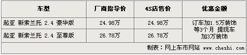 笔者了解,目前进口起亚索兰托现车一直比较紧张,即使是一般的订单客户也需要在原来车价基础上加1.5万元的装饰,而提现车的话最高也要加3万元装饰。消费者如果按照正常的订单周期,需要在6月份才能提到现车,如果加装饰的话需要等3个月时间才能提车。