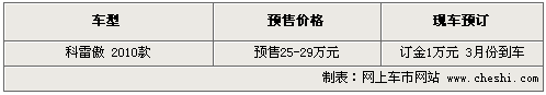据4S店销售人员介绍:2010新款雷诺科雷傲外形方面:标配为新17寸合金轮毂,也可选配18寸合金轮毂;内部新增手套箱锁、报警器、镀铬件、新尾翼、Arkamys专业音频处理、Cbox、超级门锁等,另外有黑色内饰可选。目前店内已经开始接受这款新车的预定工作,订金为1万元。首批订车的消费者最快在3月底即可提到现车。