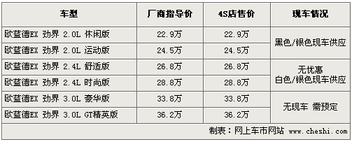 笔者了解,目前欧蓝德EX暂时没有现金优惠,但4S店已经有现车供应,其中2.0两款有黑色/银色现车供应,2.4L两款有白色/银色现车供应,3.0排量两款暂时还需要预定,订金为2000元,2月底可以到现车。