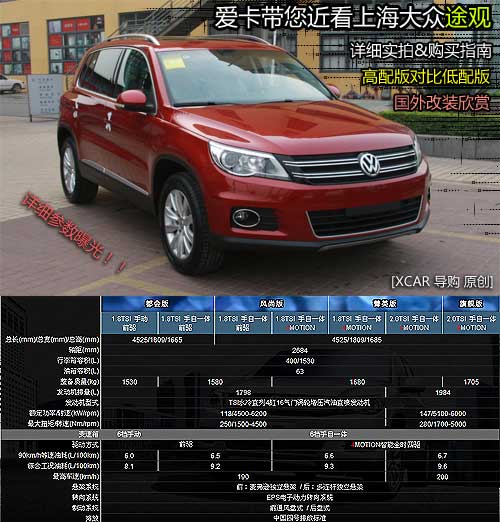 从厂家提供的参数表看,国产的途观总共有7款车型,由低到高是,都会版、风尚版、菁英版和旗舰版。7款车型分别搭载大众旗下的1.8TSI和2.0TSI发动机,两款2.0TSI车型均为四驱,而搭载1.8TSI发动机的车型则提供了前驱和四驱总共5款车型可供选择。预计价格区间在20万-30万左右。