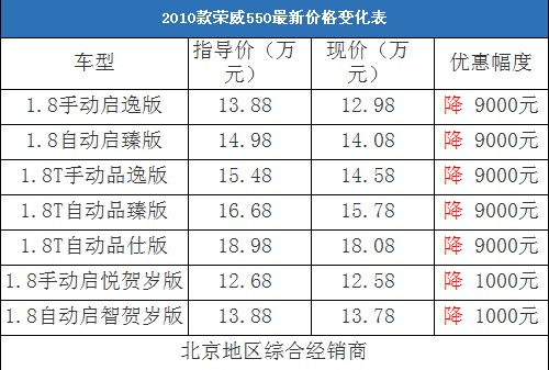 近日,编辑从北京地区综合经销商处了解到,荣威550的现车充足,目前厂家推出了启悦版和启智版的贺岁版车型,除了贺岁版车型降价1000元外,其他车型均降价9000元。以下是荣威550最新价格变化表: