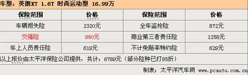 以指导价16.99万的英朗XT 1.6T 时尚运动型为例,保险方面购买了第三者50万元责任险,每年的保险费用为6789元。
