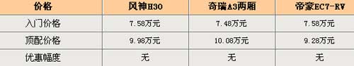 吉利的动作更迅速,早在2009年11月22日帝豪正式推出EC7-RV,上市的新车有1.5L和1.8L两个排量共六款两厢车型,分别是1.5L MT舒适型、1.5L MT豪华型、1.5L MT尊贵型、1.8L MT舒适型、1.8L MT豪华型以及1.8L MT尊贵型。售价从7.58-9.28万元。