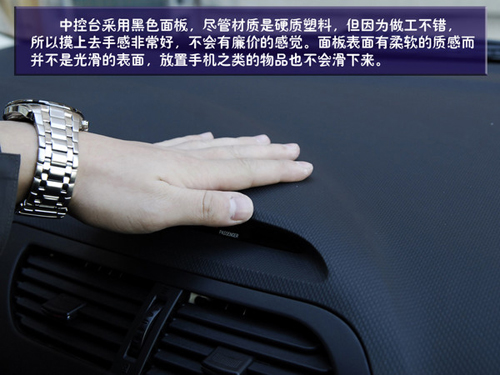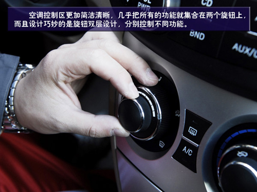 空调控制区就更加简洁了,几乎把所有的功能就集合在两个旋钮上,而且设计巧妙的是旋钮双层设计,分别控制不同功能。但在使用时我们发现旋钮的指示标是一个小的凹槽,在光线不足是可以看到是一个小灯,但在白天时这个凹槽并不十分明显,可能会造成读取的小障碍。