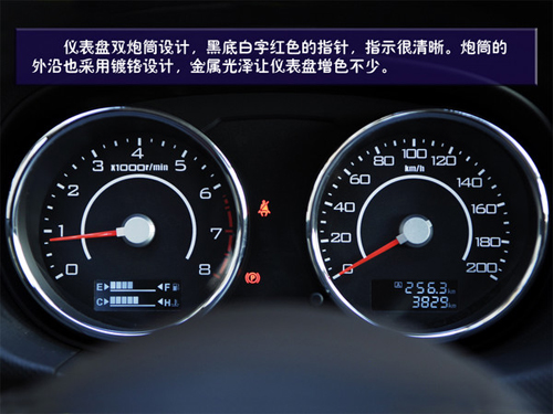 仪表盘双炮筒设计与运动风格相统一,黑底白字红色的指针,指示很清晰。炮筒的外沿也采用了镀铬设计,金属光泽让仪表盘增色不少。转速表的炮筒内集成油箱和水温表,用方格来显示。时速表炮筒内集成公里计数,而这里显示的分别是总里程和短时里程,不需要切换,读取更方便。
