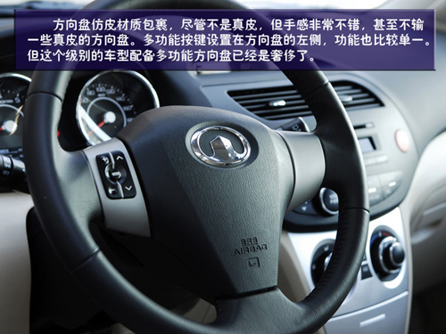 方向盘覆盖仿皮材质,尽管不是真皮,但手感非常不错,不夸张的说甚至不输一些真皮的方向盘。多功能按键只设置在方向盘的左侧,功能也比较单一。但这个级别的车型配备多功能方向盘的有几个,这样看来凌傲真的是够厚道了。
