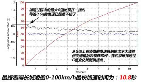 虽说从参数上看,这款GW4G15发动机的最大扭矩是出现在4000rpm左右,但在测试时编辑发现用4000rpm起步后转速会掉的很多,没有做到最大扭矩起步的目的。所以编辑尝试5000rpm起步,凌傲的前轮难以避免的出现了打滑的情况,不过车身抬头的情况并不是特别明显,这个转速起步后,发动机的转速虽然也会掉,但离最大扭矩输出的点比较靠近,所以起步效果比4000rpm还要好一点。最终凌傲0-100km/h的最好加速成绩为10.8秒,这个成绩在这个级别的国产车中是比较靠前的成绩!