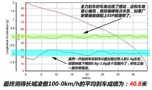 从刹车图表上看,凌傲的初段刹车力度非常足,开始时最大的G值竟然超过了1.3G左右,但比较遗憾的是没能保持下去,在整个刹车过程中出现了比较大的波动,不过好在之后的刹车G值也能保持在1G左右,另外较硬的悬挂以及紧凑的车身也对刹车成绩有一定的帮助。
