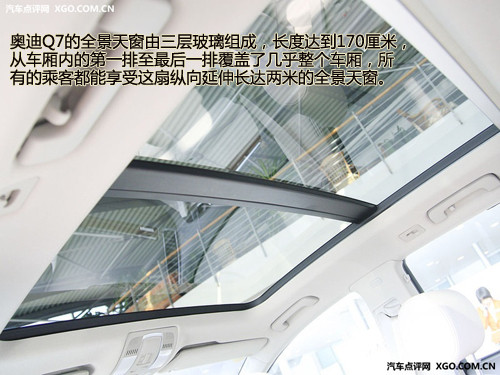 作为奥迪旗下的第一款SUV车型,奥迪理所当然的为我们带来了豪华的全景天窗配置。这个被称为“Open Sky”的全景天窗,由三层玻璃组成,长度达到170厘米,从车厢内的第一排至最后一排覆盖了几乎整个车厢,所有的乘客都能享受这扇纵向延伸长达两米的全景天窗。