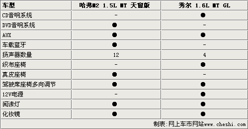 在娱乐性和舒适型配置方面,哈弗M2天窗版采用DVD音响系统,相比秀尔的CD音响则更出色。另外,哈弗M2采用12声道扬声器,比秀尔4声道扬声的音响效果更好。哈弗M2天窗版还配备了真皮座椅,而秀尔则采用织布座椅。不过哈弗M2全系都没有配备12V电源,相反秀尔全系标配了外接电源。