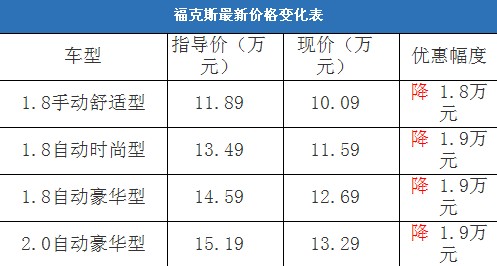 近日,编辑从北京地区长安福特4S经销商处了解到,福克斯的现车充足,颜色也比较全,但是目前购车没有任何优惠,只能消费者到店与销售人员详谈才可以争取少量优惠。相比之下,福克斯在综合经销商处的优惠最高达到了1.9万元,性价比非常不错。以下是福克斯三厢最新价格变化表:
