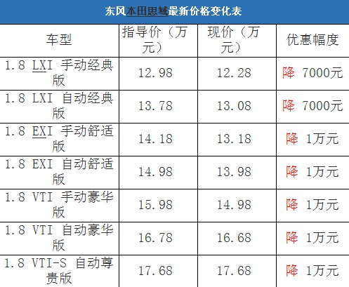 近日,编辑从北京地区东风本田4S经销商处了解到,思域有少量水晶紫、水晶银色现车,部分车型预定需要等待1个月左右就可以提车。据经销商透露,除了经典版优惠7000元外,其他车型均可以优惠1万元现金,与去年末相比性价比有所提升。以下是思域最新价格变化表: