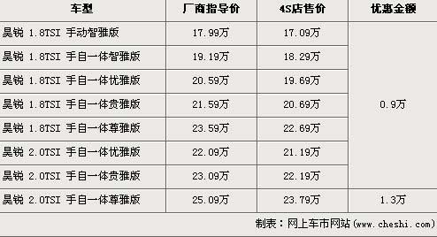 据北京斯柯达经销店销售人员介绍,斯柯达昊锐共分为8个车型,售价区间为17.99-25.09万元。目前店内昊锐全系除了最高配的2.0T尊雅版以外其他车型均优惠9000元,经优惠后,昊锐入门级售价降到了17.09万元。最高配的2.0T尊雅版更是有1.3万元的优惠,售价从25.09万元降到了23.79万元。