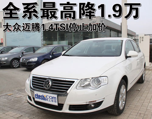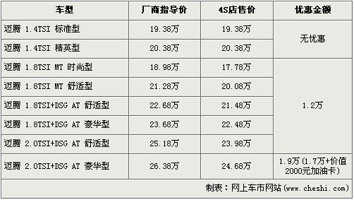 据北京一汽大众经销店销售人员介绍,迈腾全系最高配的2.0TSI自动豪华版灰色车型近期出现了总价值1.9万元的优惠,其中包括了1.7万元的现金优惠,并且赠送价值2000元的加油卡。销售人员还介绍,迈腾新上市的1.4TSI车型停止了前段时间的加价,店内有现车,1.8TSI车型优惠1.2万元。