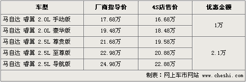 据一汽马自达4S店销售人员介绍,睿翼2.5排量三款车最高优惠2.1万元,2.0排量车型目前优惠也达到了1万元。另据4S介绍,在过年期间优惠幅度可能会有所回收。目前店内有黑色、银色、紫色等现车供应。如消费者有意购买,到店详谈会有更优惠的价格。北京地区各4S店由于订单不同,各店销售的现车颜色有所不同。
