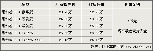 据东风本田4S店销售人员介绍,目前购买思铂睿全系优惠1万元,入门级车型优惠后最低售价为22.78万元。现在店内大部分车型现车充足,款色比较齐全,颜色以黑色、银色等现车供应,运动版有少量红色现车供应。购买豪华版和尊贵版如果加导航的话,另外需加1.2万元左右,相比而言导航版车型更为超值。如消费者有意购买,到店详谈会有更优惠的价格。北京地区各4S店由于订单不同,各店销售的现车颜色有所不同。