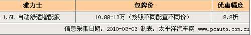 雅力士自推出以来便成为欧洲最畅销的两厢车,缔造了全球紧凑型两厢车市场的销量传奇。凭借强劲的动力性、堪比豪华车的安全性及时尚、个性的特质成为许多年轻人购车的首选目标之一。但国内雅力士上市定价过高导致销量表现一般。近期,雅力士出现比较大的优惠幅度,其中商家推出的“增配版”雅力士车型优惠幅度更是原价的8.8折。据经销商介绍,本次增配版是在1.6L舒适型的基础上增加运动套件和DVD导航和一系列舒适配置供消费者选择,售价方面根据消费者的要求而调整,最高优惠近1.5万元。