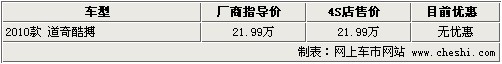 据道奇4S店销售人员介绍:目前2010款道奇酷搏北京地区无现车,但部分4S店内接受预订,定金为5000元。据经销商介绍,2010款酷搏计划将在第二季度引入中国,但最早可能在3月份到店销售。2010款酷搏仍将搭载2.0升自然吸气发动机,在配置上将与08款车型相差不多,相比09款车型配置更丰富;此款车型售价为21.99万元,在价格方面与老款车型持平。