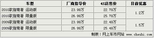 据4S店销售人员介绍:指南者目前共有2009款及2010款车型,分别为运动版及限量版总共4款。09款车型现车颜色为黑色及绿色,全系优惠1.5万元;2010款车型有黑色、绿色、红色,最高优惠1.2万元。目前老款及新款优惠价格相对较高,如果到店洽谈会有简单装饰赠送。09款指南者优惠后最低仅售22.49万元,凸显性价比。