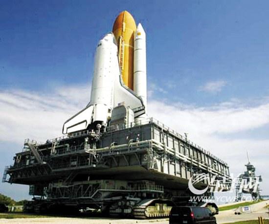 “爬行者”的4个角上各“长”着一只“大脚”———4辆长12.6米、宽7.3米的履带车。每只“大脚”上“穿”着两只“铁鞋”———两条2.3米长的履带,每条履带由57节钢链组成,每节重一吨。每只“脚”可以绕一根巨大的导管转动,用来改变方向,并使“爬行者”以每分钟10度的速度完成半径152米的转弯。每只“脚”的上面各有一个液压千斤顶,通过计算机的控制,能把6000吨的重量举起1米。通过安装在钢链一端的发动机,以及一套速度控制装置,4只“脚”为“爬行者”提供三种爬行速度:空载时,最大速度每小时3.2千米;负载时,每小时1.6千米;爬5度斜坡的发射台时,每小时0.8千米。